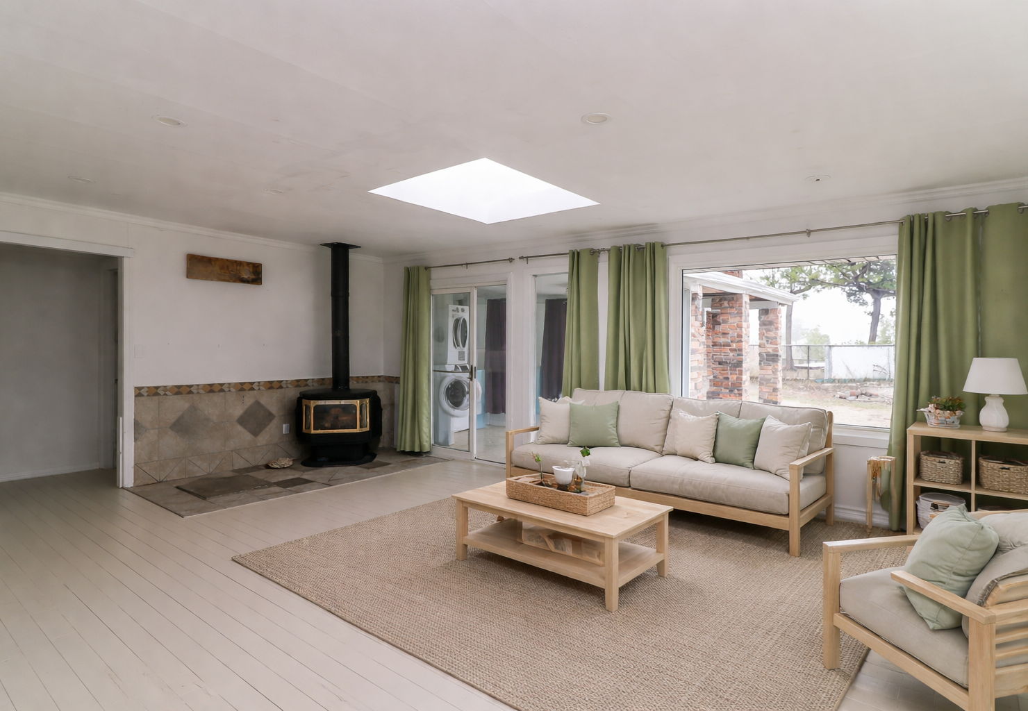 The bright, spacious living room has a fireplace and opens into a seasonal sunroom with laundry.